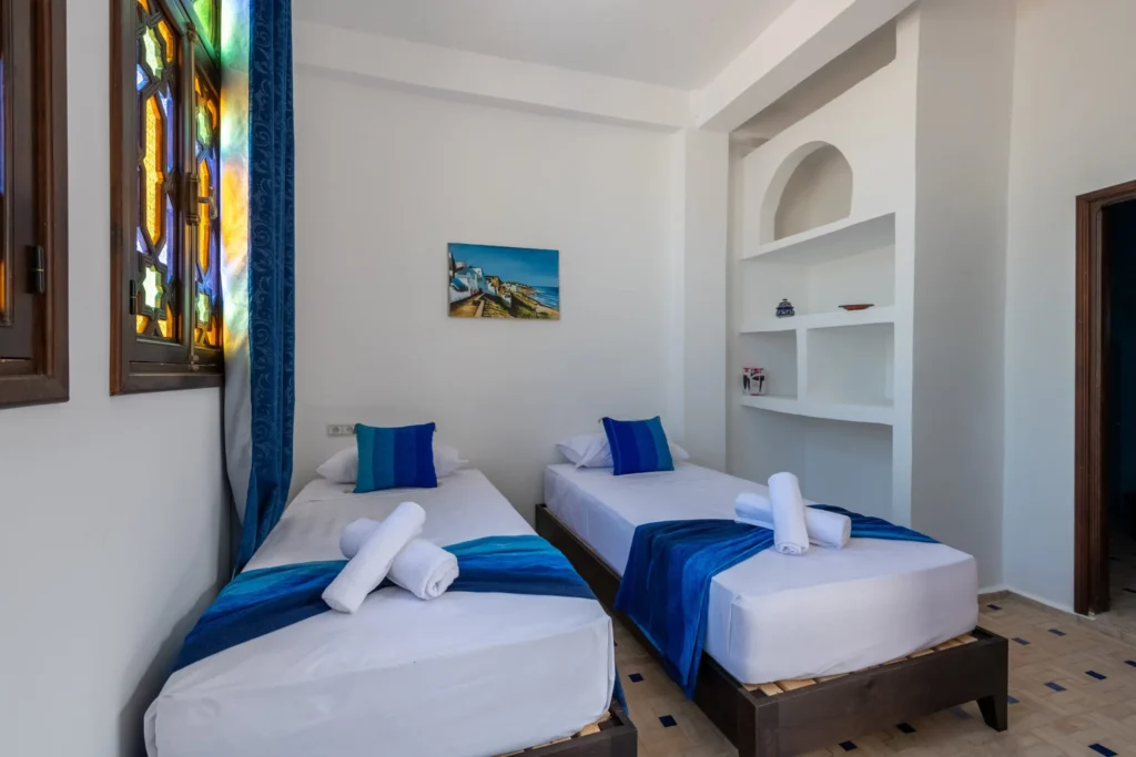 Every morning, guests enjoy a traditional Moroccan breakfast served on the terrace, featuring fresh bread, local specialties, and hot drinks. Breakfast options are continental and halal, adapted to diverse dietary needs.